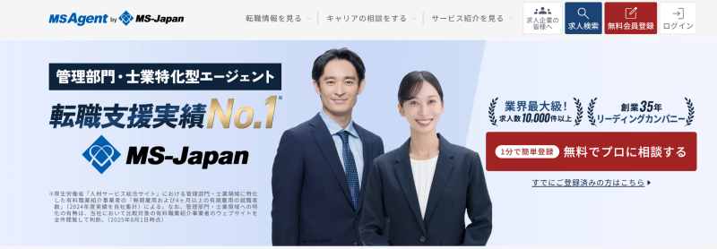 MS-Japanが運営する「MS Agent」は、管理部門や士業に特化した転職エージェントです。経営企画・経理・財務・人事などの管理部門やエグゼクティブ職のほか、公認会計士・税理士・弁護士・社労士などの専門職に強みがあります。取り扱う求人の90%以上が非公開で、質の高い求人が多いことが特徴です。