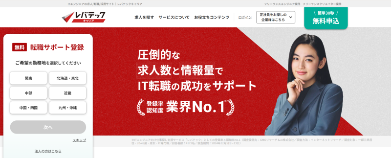レバテックキャリアは、IT・Web業界の転職エージェントです。スキル別の検索機能や多様な働き方の検索、状況に合わせた転職相談が可能で、経験を活かしたいWebマーケターの転職におすすめです。