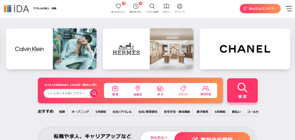 iDAは、ファッション・アパレル・コスメ・美容部員の専門職に特化した人材派遣・紹介を行う転職サイトであり、転職支援サービスも提供しています。
