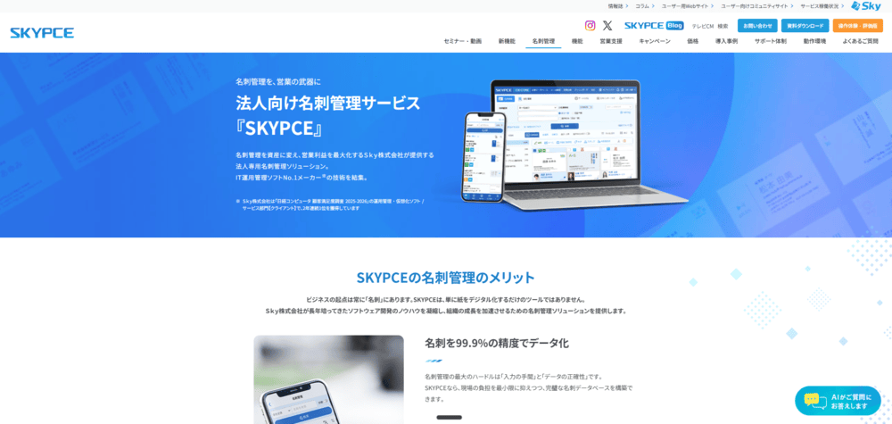 SKYPCEは、累計24,879ユーザー/1,286万クライアント規模の運用を支えてきたSky株式会社が提供する、高い国内シェア率を誇る法人向け名刺管理サービスです。